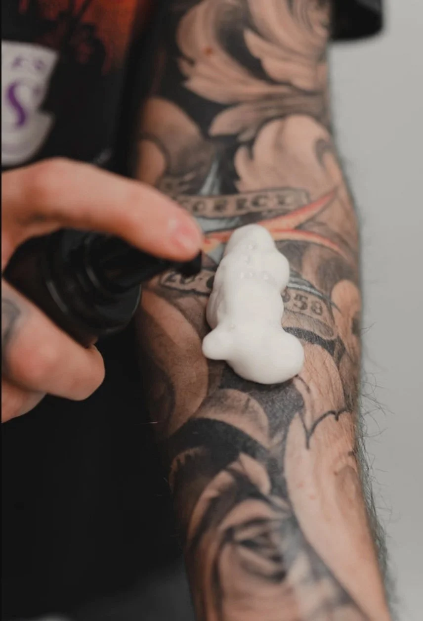 Noah will apply one sheet of Derm Shield to your tattoo after application. This first sheet can stay in place for up to 24 hours, and no longer. It is normal for blood and fluids to collect under the bandage.